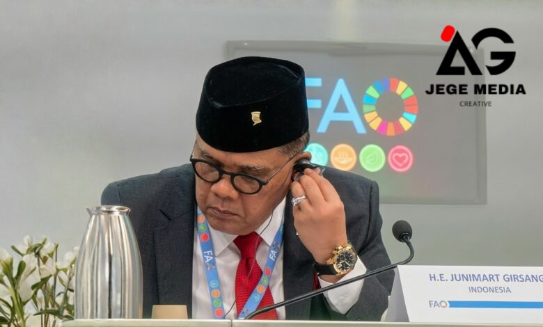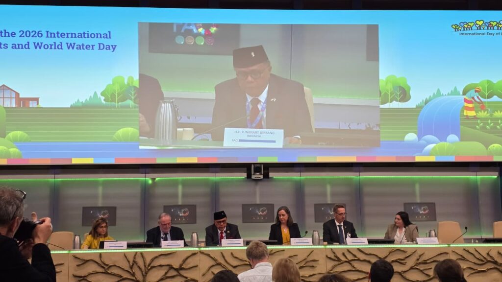 Roma, JegeMedia.com – Duta Besar Republik Indonesia untuk Italia, Prof. Dr. Junimart Girsang, menegaskan komitmen Indonesia dalam mendorong pengelolaan hutan dan sumber daya air secara berkelanjutan dan berkeadilan dalam perayaan bersama Hari Hutan Internasional dan Hari Air Dunia 2026 di Markas Besar FAO, Roma, 19 Maret 2026.