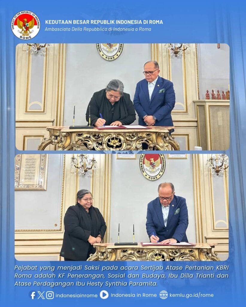 Jege Media, Roma – Kedutaan Besar Republik Indonesia (KBRI) di Roma, Italia dibawah pimpinan Prof Junimart Girsang menyelenggarakan Acara Serah Terima Jabatan (Sertijab) Atase Pertanian.