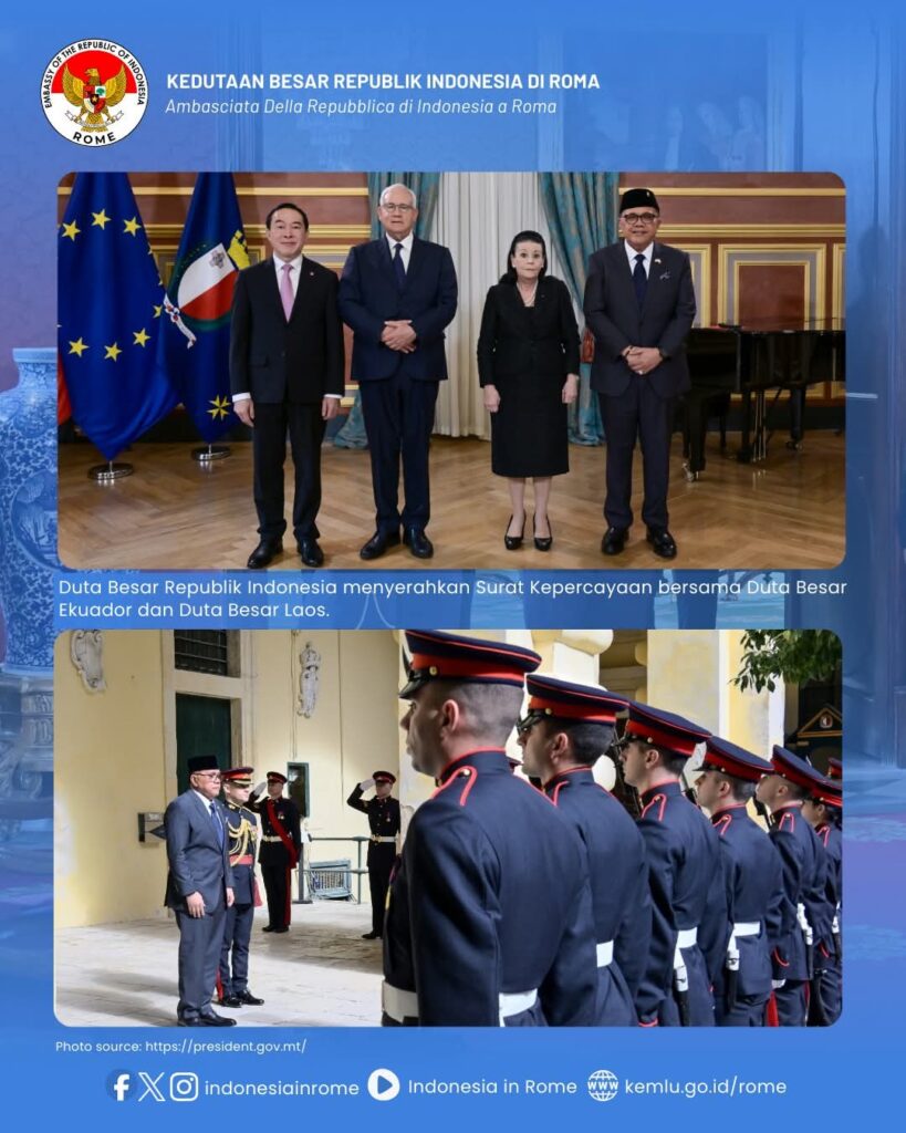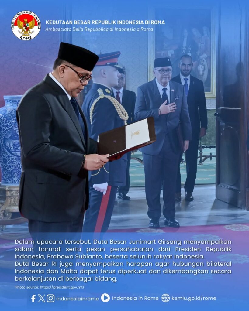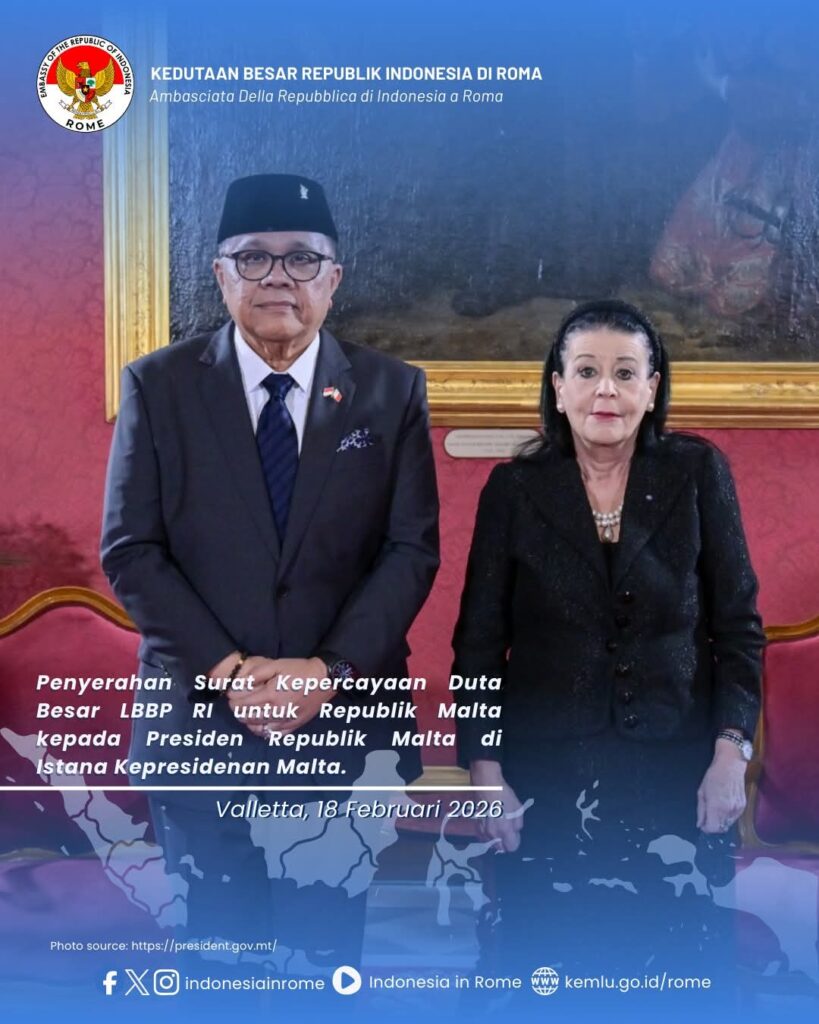 Dikutip dari laman Instagram KBRI Italia pada, Jumat 20 Februari 2026, Dubes Junimart telah menyerahkan Surat Kepercayaan kepada Presiden Republik Malta, Myriam Spiteri Debono pada, Rabu 18 Februari 2026.